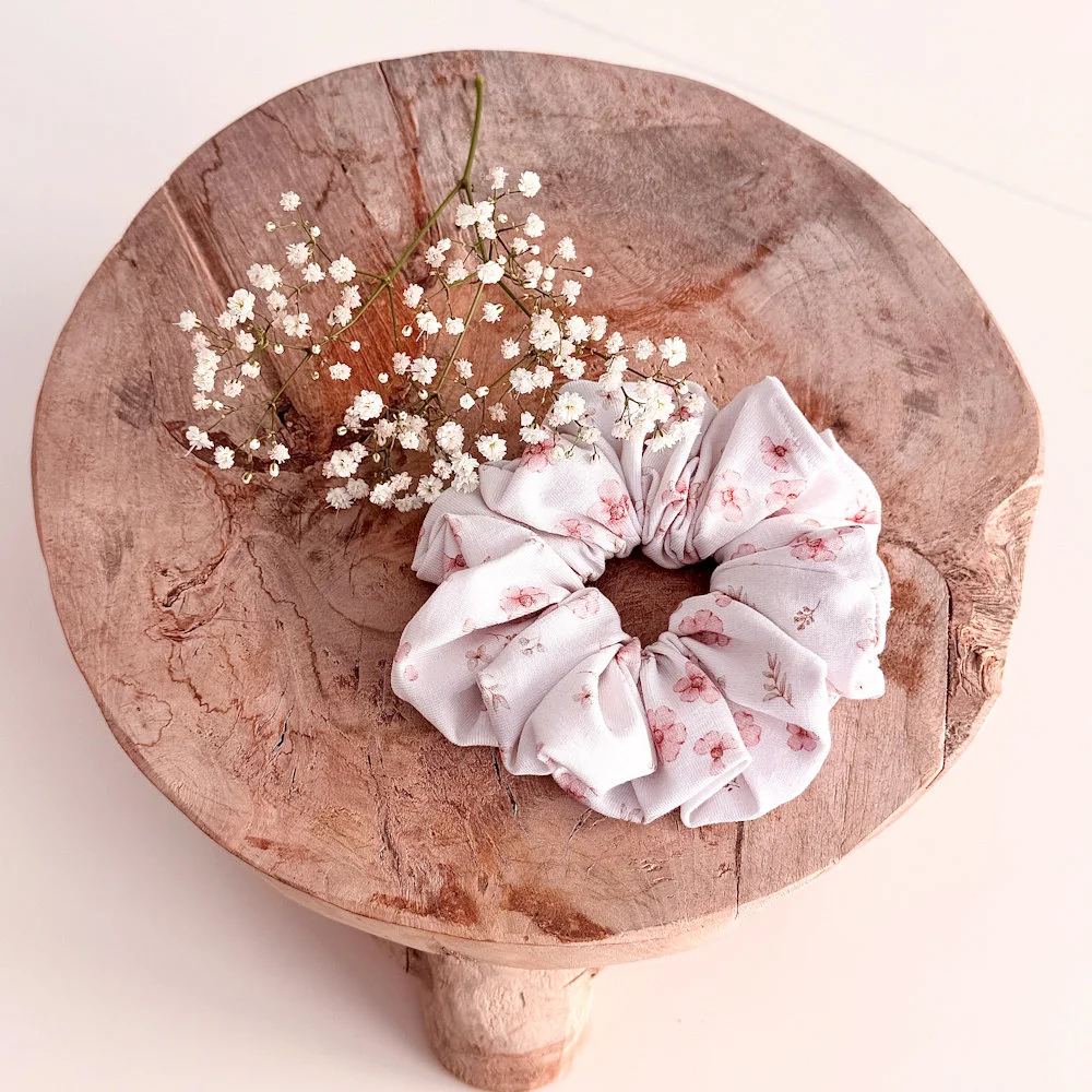 Du kannst Deinen gewünschten Designstoff frei auswählen und Dein Scrunchie ganz individuell gestalten. Das auf den Produktbildern gezeigte Modell wurde im Designstoff „Glowing“ gefertigt.