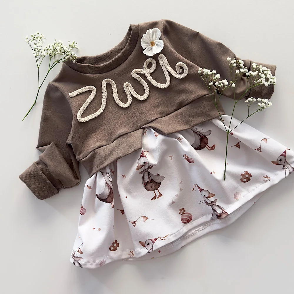 Das Sweater Girly Kleidbesteht aus weichem French Terry im Oberteil und einem Rockteil aus unserem Jersey Designstoff "Ola Oie". Dank der cleveren, mitwachsenden Bündchen kann das Kleid mit dem Kind mitwachsen – so lässt es sich nicht nur als Kleid, sondern später auch als bequemer Sweater tragen.
